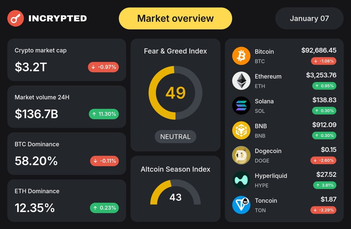- BTC ≈$92 700 (-1.08%) - ETH ≈$3 250 (+0.95%) - SOL ≈$139 (+0.30%) - Капитализация рынка ≈$3.2T (-0.97%) - Индекс страха и жадности: 49 (нейтральный) - Индекс альтсезона: 43 Детальнее в инфографике.