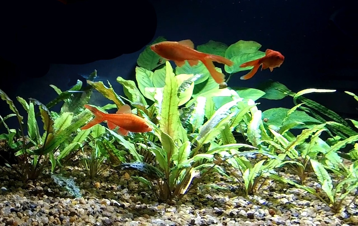 Вишнёвых барбусов разводить не сложно. Нересты всегда были спокойными и успешными. Икры получалось немного, но она практически вся оплодотворялась и продуктивность нерестов была высокой. Подростки равномерно росли и не нуждались в сортировке по размеру, отчего трудозатраты при выращивании Вишнёвых Барбусов были небольшими. Нерестовик размерами 38Х38Х20 см объёмом около 30 литров. На дно уложена предохранительная сетка, защищающая икру от поедания производителями. Пробовал однажды нерестить рыбок без сетки. Икра рыбками осталась нетронутой. Нерестовик заполнил на две трети свежей отстоянной водой. Из растений использовал Наяду. Она хорошо заполняет объём аквариума и не всплывает как, например Роголистник. Установил слабую аэрацию. Обогреватель не использовал. Температура воды 26 градусов. Когда посадил пару на нерест, через некоторое время долил пермеата осмоса той же температуры, что должно было стимулировать нерест. Рано утром начался нерест. Надо сказать, что рыбки не играли в дог