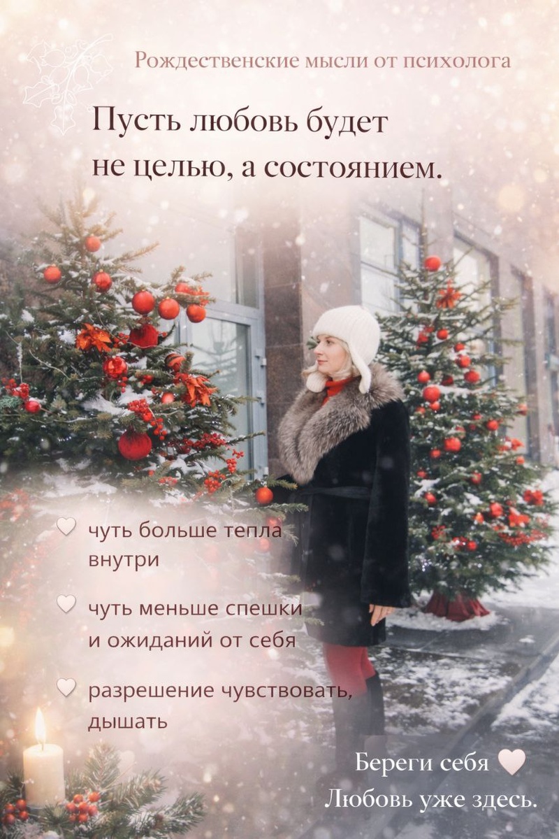 🤍 Пусть любовь будет не целью, не чем-то, к чему нужно идти, заслуживать или доказывать. А состоянием. Тем, в котором можно быть собой. Живым. Настоящим. Неидеальным. Пусть сегодня станет чуть больше тепла внутри, чуть меньше спешки и ожиданий от себя. Пусть будет разрешение чувствовать, останавливаться, дышать, выбирать мягкость. Рождество — это про свет, который не ослепляет, а тихо остаётся рядом. Берегите себя 🤍