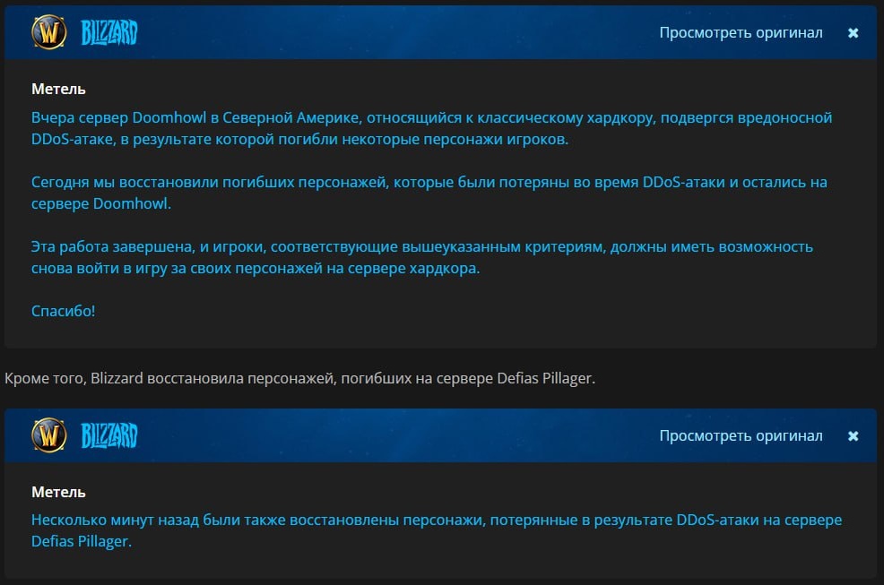 Компания Blizzard объявила о восстановлении всех хардкорных персонажей Doomhowl, погибших в результате DDoS-атаки 4 января на классическом хардкорном сервере.