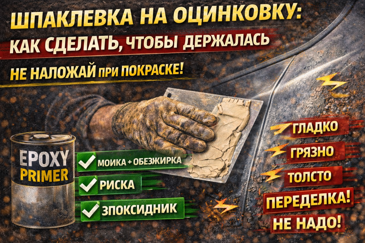 - Если шпаклюешь прямо по оцинковке — делай маленькими зонами, с честной риской и тонкими слоями (многие шпаклёвки допускают оцинковку как основание при правильной подготовке). (Evercoat Training Portal)
