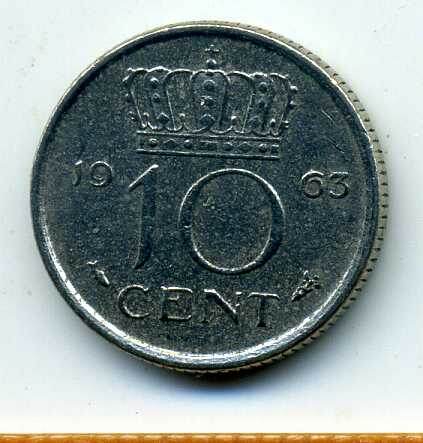 Продаю монета Нидерланды 10 центов 1963 год. никель. диаметр 14 мм. Стоимость 20 рублей.