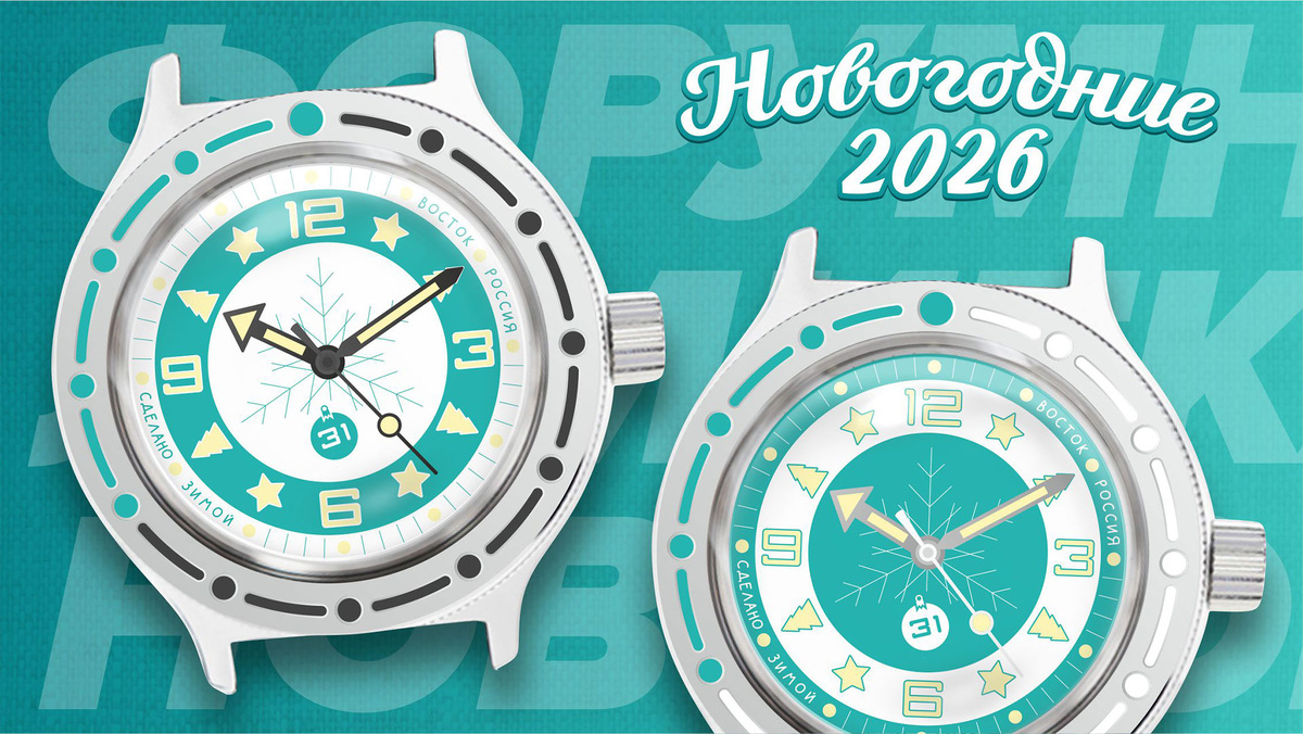 Новогодняя тема в часах — жанр коварный. Грань между атмосферной праздничностью и избыточной декоративностью здесь особенно тонка. В этом проекте она, к счастью, не только найдена, но и осмысленно обыграна сразу в двух вариантах оформления циферблата — А и Б, каждый из которых раскрывает зимнюю идею по-своему. СПОКОЙНАЯ ЗИМА И БЛАГОРОДНАЯ СДЕРЖАННОСТЬ Первый вариант воспринимается как наиболее уравновешенный и «взрослый». Он лишён кричащей праздничности, которая была характерна для прошлогодней «Мандаринки», и вместо этого предлагает спокойное, благородное и очень зимнее настроение. Это не витрина новогоднего магазина, а морозное утро, тишина и мягкий свет. Оттенок тиффани в варианте А чуть уходит в зелень, создавая ощущение прохлады и свежести. На этом фоне особенно выразительно смотрятся контрастные люминесцентные элементы — цифры, звёзды и ёлочки. Днём они не перегружают композицию, а в темноте проявляются ярко и эффектно, превращая циферблат в по-настоящему праздничный, но не навяз