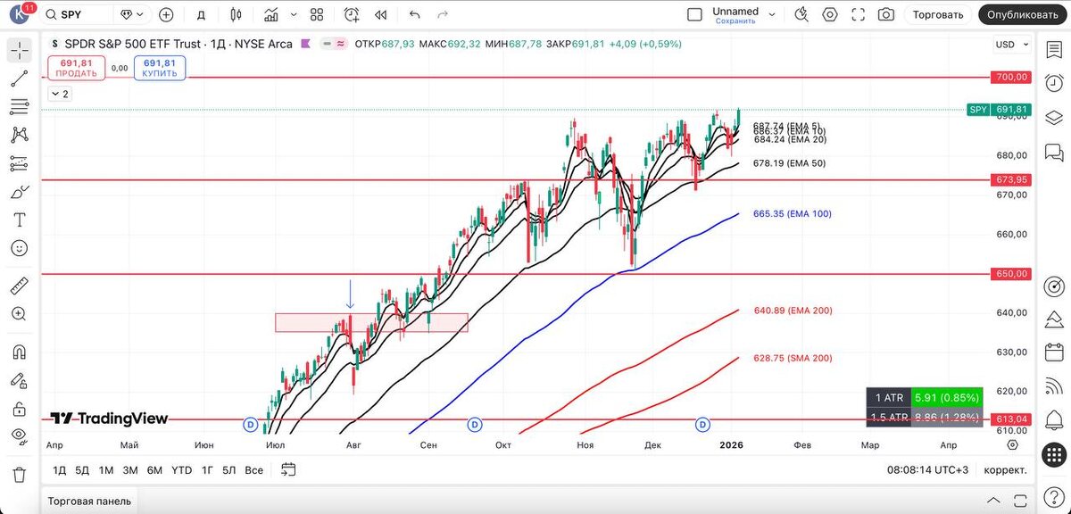 исторический максимум — не ограничиваем движение выше и пока что не фиксируем позиции. Также учитываем небольшую слабость на $MAGS и создавшуюся узкую консолидацию на $QQQ — не удивлюсь, если ещё бигтехи потянут рынок дальше. Но не исключаем и более лучший сценарий: если в ближайшие дни увидим красные дни, учитывая параболу на ротационных отраслях $DIA, $RSP, $NYA, $RUT и на $SMH + $SPY в зоне локального максимума + $ES1! в зоне локального максимума, а также у юбилея 7 000$ + $SVXY и $SVIX долгое время прыгают по супербыстрой скользящей 5 EMA D. Как вчера отметил приборы $SVXY и $SVIX, они более-менее синхронизировались с $SPY, и сейчас пулбэк и возврат к быстрым скользящим будут примерно одинаковыми, а значит — не такими глубокими, и скользящие подтянутся — продолжим накапливать базу у сильного уровня сопротивления. Важно давать рынку время, не торопиться и защищать капитал (перед ростом 3 позиции закрылись в стоп б/у). Но сейчас картина рынка стала более понятной, и при красных дн