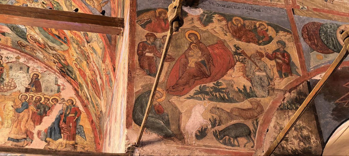 На северо-западном столбе на одной из граней мастер изобразил необычных волхвов. Тех самых, что принесли дары Господу на Рождество. Они не идут, как на иконах, как описано в Евангелие. Они ... скачут на конях! Это настолько странно, что может возникнуть подозрение - Дионисий попрал иконографические каноны? Ан нет. Мастер был самый что ни на есть твердый приверженец православного изображения. Но тут его художественная свобода дополнила жесткие каноны: его волхвы скачут... в Царство Небесное. То есть свершилось, Господь родился, и распят, и воскрес! Его первые "поклонники" (те, кто поклонился и принес дары) возносятся в Рай. А на противоположной стене, там, куда несут волхвов кони, Дионисий изобразил "Хвалу Богородице".