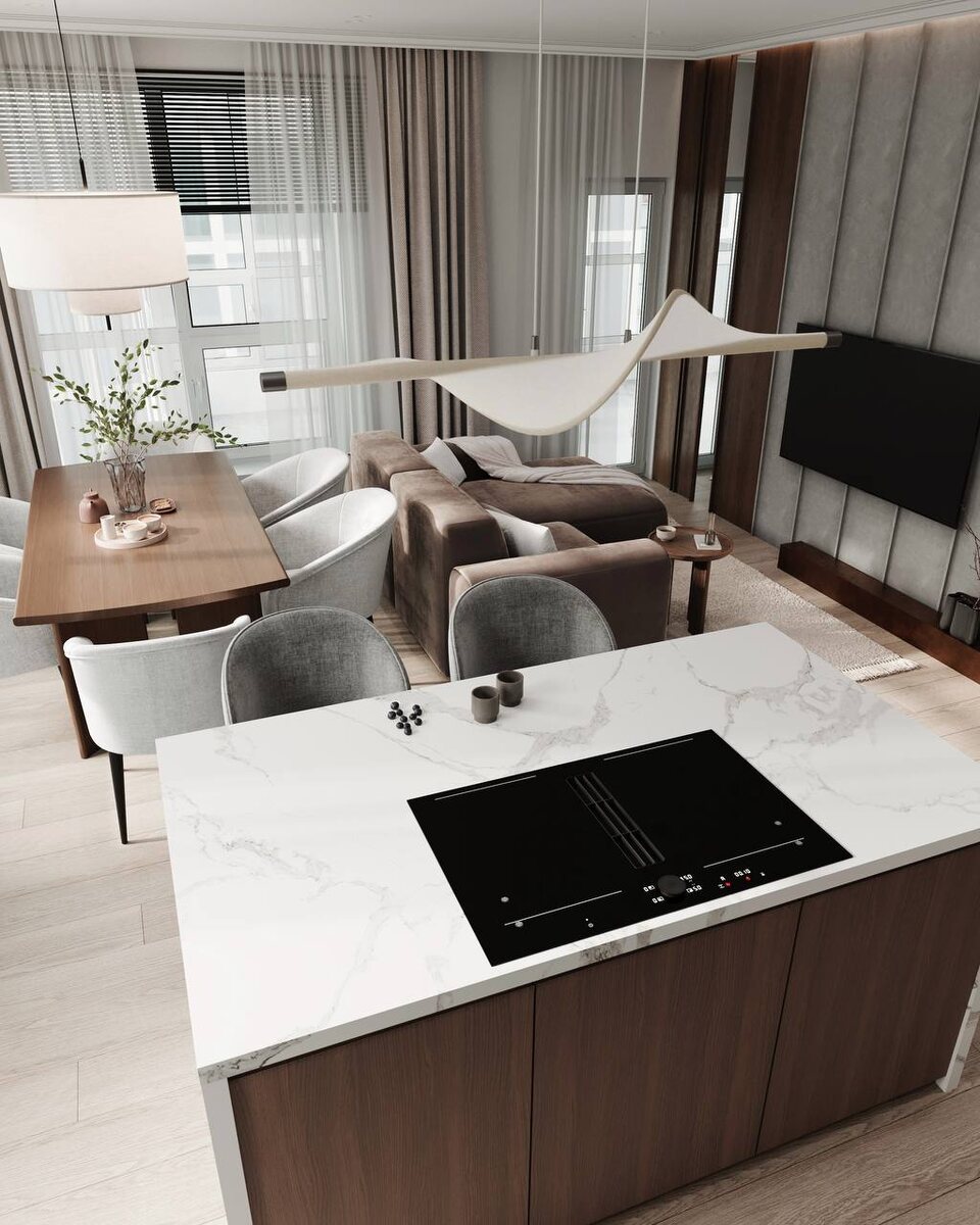 Кухня-гостиная из проекта квартиры для семьи с двумя детьми в ЖК WOW