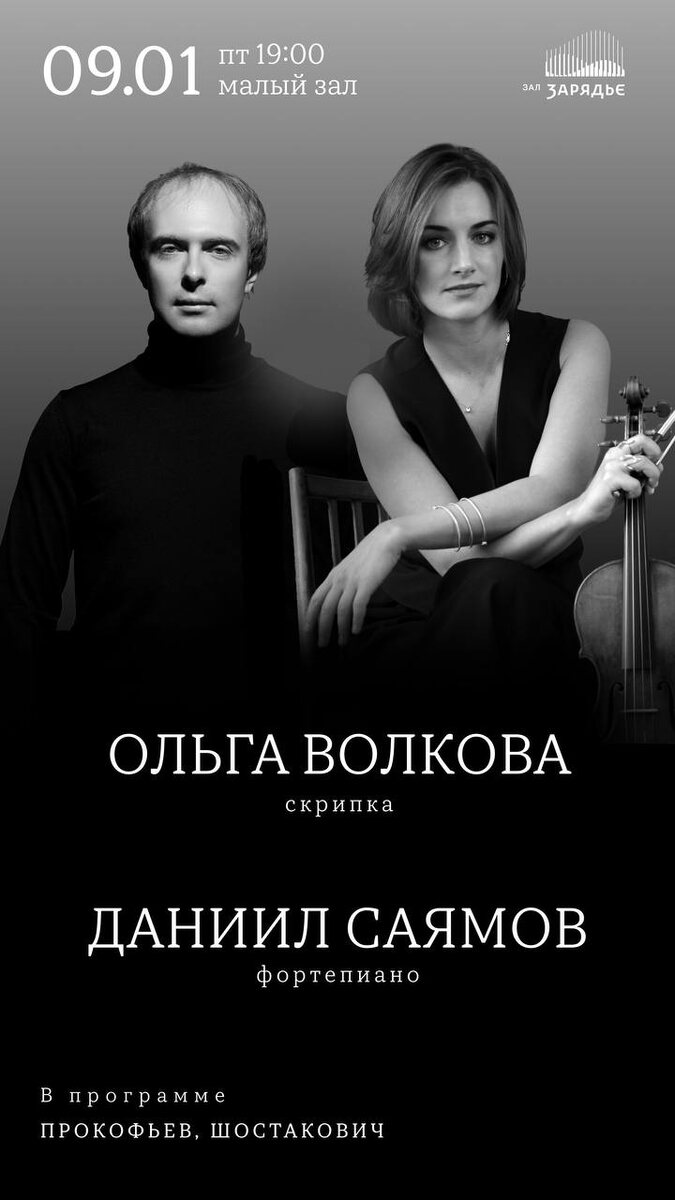 9 января 2026 в Малом зале Зарядья Ольга Волкова (скрипка) и Даниил Саямов (фортепиано) представят программу камерной музыки.