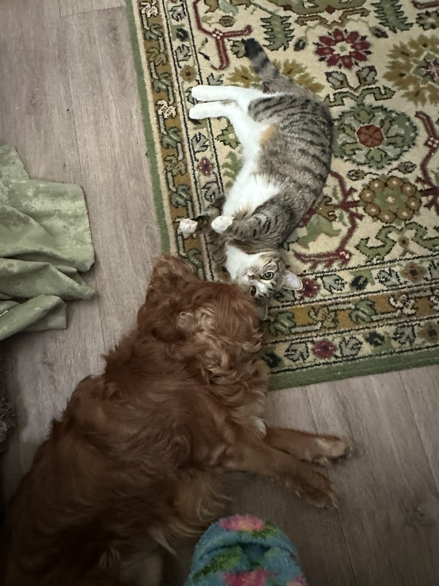 Доброе, предоброе утро от малышей. Недоброе и не утро от Арчи. -Не знаю, мне всё нравится и утро, и моя косточка и вообще всё - всё. Прячет везде свою кость, схватит её и бегает, ноет, надо спрятать. Обычно это мамина подушка бывает, его только оттуда я не вытаскиваю. Лопатки, утка, кукла без головы, машинка без колёс, половинка свиньи ну и мячик естественно. Кто там ходит? Мы сейчас выйдем... -Мама, я не ел снег, я на секундочку выбежал посмотреть... Сидяяят, не боятся ведь, сидяяят, клююют...прилетели...Эх, вот бы мне выйти, я бы их погоняла... Доброе утро, ребята! Ваша Мавруша и все- все- все...