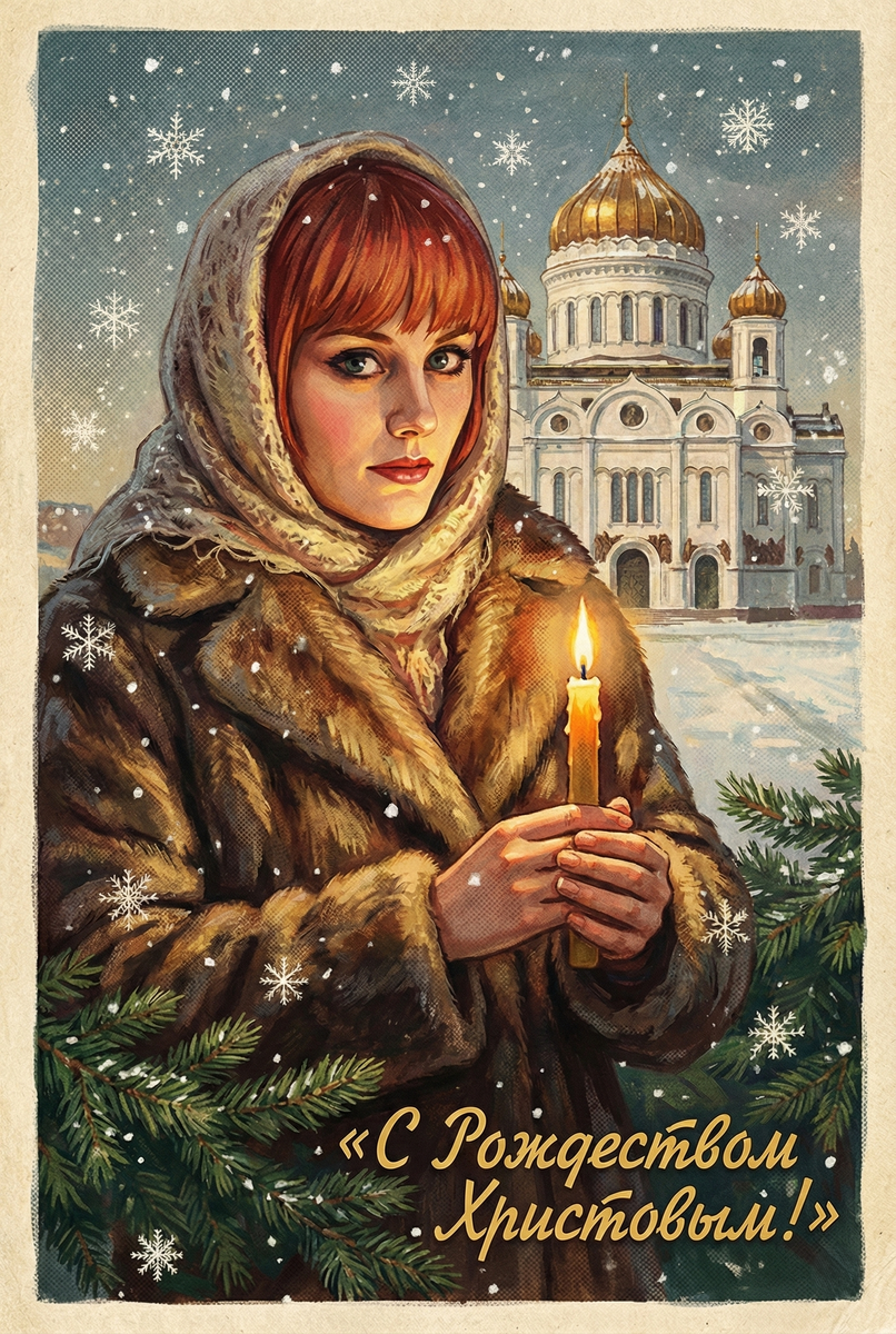 Традиция поздравлять родных и друзей, отсылая им через соцсети и мессенджеры красочные картинки, пришла на смену советскому обмену открытками. Но суть осталась неизменной: уделить внимание человеку, который тебе дорог. С развитием ИИ-технологий каждый может сделать красивое изображение и порадовать им близких. Я предлагаю вам сгенерировать открытки со своим изображением или фотографиями детей по моим авторским промптам, чтобы поздравить дорогих вам людей с православным Рождеством Христовым. Как подключиться к нейросети или боту в ТГ, подробно описано здесь: Вы просто подключаетесь к нейросети Gemini с помощью vpn или используете бесплатную генерацию одного из чат-ботов в ТГ. Прикрепляете нужное вам изображение и сообщаете нейронке следующий промпт: "Не изменяй, не искажай и не подвергай какой-либо стилизации лицо женщины. Сохрани полное сходство с референсом, точные черты лица, мимику и пропорции, без мультяшности. Рождественский портрет в стиле советской открытки 1950–70-х годов. Жи