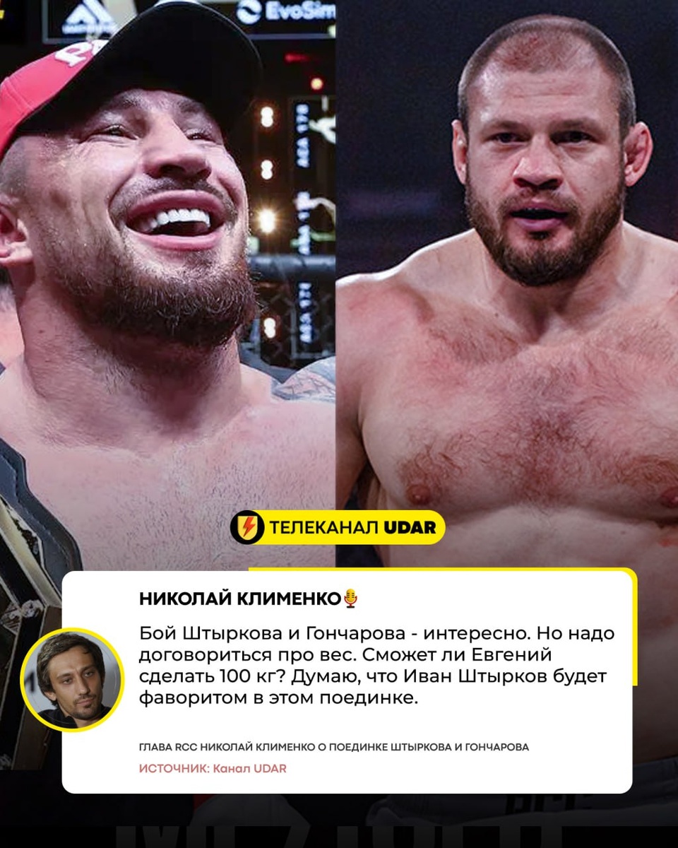 !" После вызова экс-чемпиона АСА Евгения Гончарова в адрес Ивана Штыркова глава лиги RCC Николай Клименко прокомментировал возможный поединок и обозначил условия проведения: 🎙️"Это интересно! Но надо договориться про вес, потому что Евгений Гончаров - настоящий тяжеловес. Сможет ли он сделать, например, 100 килограммов? Потому что Иван - это природный полутяжеловес, который может чуть пододвинуться в весе. А формат поединка - исключительно RCC Fair Fight - кикбоксинг в маленьких перчатках. Думаю, что Иван Штырков будет фаворитом: у него больше опыта в выступлениях по К1, он отлично работает руками и ногами. Но в целом, этот поединок уже на карандаше!" - заявил Николай Клименко. За кого будем топить? 🔥 - Иван Штырков; ❤️ - Евгений Гончаров 👍Поддержи наш канал cвоим голосом 📺Смотрим бои в прямом эфире ⚡️ @teleudar