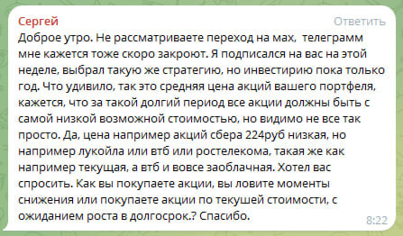 Доброго утра! Переход на Max я может быть и рассмотрел бы, но увы, он требует 10000 подписчиков, а у меня их всего 5,5 тыс человек. То есть, пока, без некоторых ухищрений, я просто физически не могу переехать в мессенджер Макс, даже если захочу. Даже если авторизуюсь через госуслуги, сдам образец ДНК, биометрию и написанную собственноручно автобиографию. Поэтому пока ожидаем. Будут бить - будем думать. Пока я новый мессенджер даже не устанавливал, поскольку звонить с парковки, мне нет необходимости. Что касается цен акций, то тут есть много нюансов, которые многие не учитывают. Самое первое - то что я начал инвестировать 9 лет назад, вовсе не обозначает, что я накупил тогда акций на 3+ миллиона. Я начал с абсолютного 0. Пополнил депозит, купил бумаги, прошел месяц, пополнил ещё, что-то усреднил, что-то купил новое и так далее. То есть месяц за месяцем, я усреднял и выросшие и упавшие бумаги. Метод равномерного-усредненного инвестирования, как бы и намекает на то, что в результате, мы п