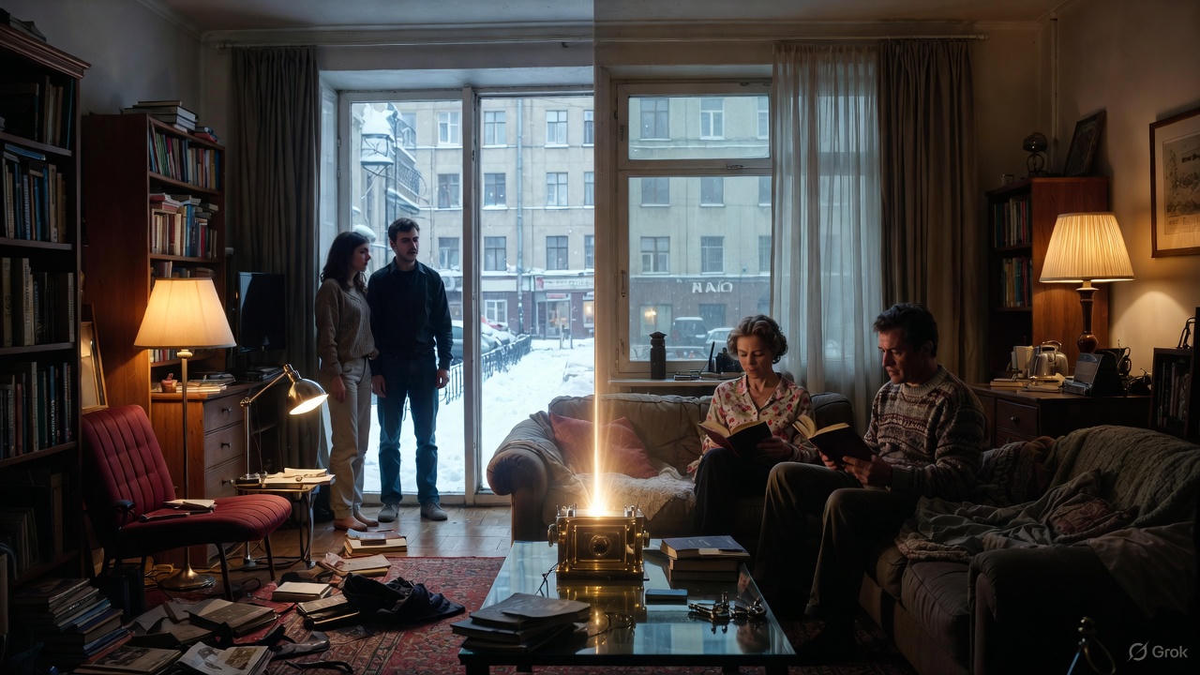 Он подошёл к окну. Сквозь свои заклеенные газетами стёкла он видел… другой вид. Не московский двор, а ленинградскую улицу, заснеженную, с проезжающей мимо «копейкой». И это было не статичное изображение. Он видел, как падает снег. Видел, как женщина с сумкой-сеткой переходит улицу. Жизнь. Другая жизнь, текущая параллельно их собственной, в том же самом «месте», но в другом времени, в другой ветке реальности.