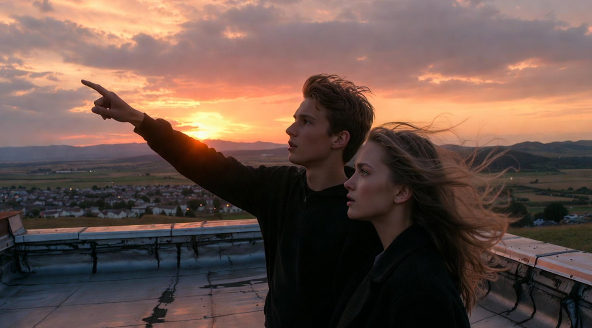 Финальная точка: Крыша мастерской. Вернувшись к студии, Марк, к её удивлению, повёл её не внутрь, а по старой, скрипучей лестнице на чердак, а оттуда — через люк на плоскую, покатую крышу, покрытую древним, потрескавшимся гудроном. Вид открывался на весь городок, на бескрайние поля за ним и на огромное, расцвеченное закатом небо.