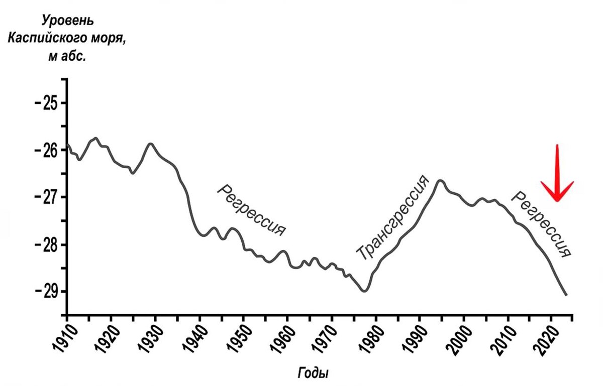 Отмечу, что уровень Каспийского моря менялся всегда, на протяжении истории. Если вы любите, как и я, документальные фильмы о природе, то рекомендую большое видео на тему «Загадки Каспийского моря»: https://youtu.be/TAIHGFF_RD0?si=YJAZ1QDtyxY3MjnQ (график взят из видео)