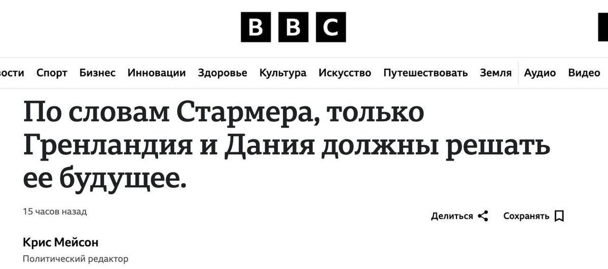 » Британия, поддержавшая нападение США на Венесуэлу, осудила стремление Трампа завладеть Гренландией. Премьер Стармер в интервью ВВС заявил, что только Гренландия и Дания должны решать будущее Гренландии. На вопрос, скажет ли он Трампу «руки прочь от Гренландии», Стармер ответил однозначно: «Да». «Дания — близкий союзник в Европе, союзник НАТО, и очень важно, чтобы будущее Гренландии принадлежало Королевству Дания и самой Гренландии, и только Гренландии и Королевству Дания», - добавил Стармер. ❌ Присоединяйтесь https://geochronic.ru 👍Хроники Геополитики👍
