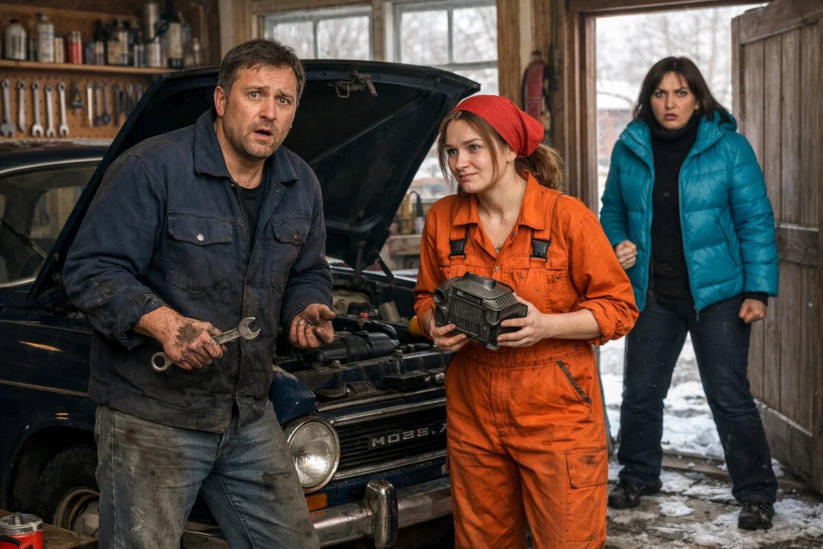 Андрей стоял, согнувшись над капотом старой машины. Рядом с ним — девушка лет тридцати, в рабочем комбинезоне, волосы убраны под платок. Она протягивала ему инструмент.