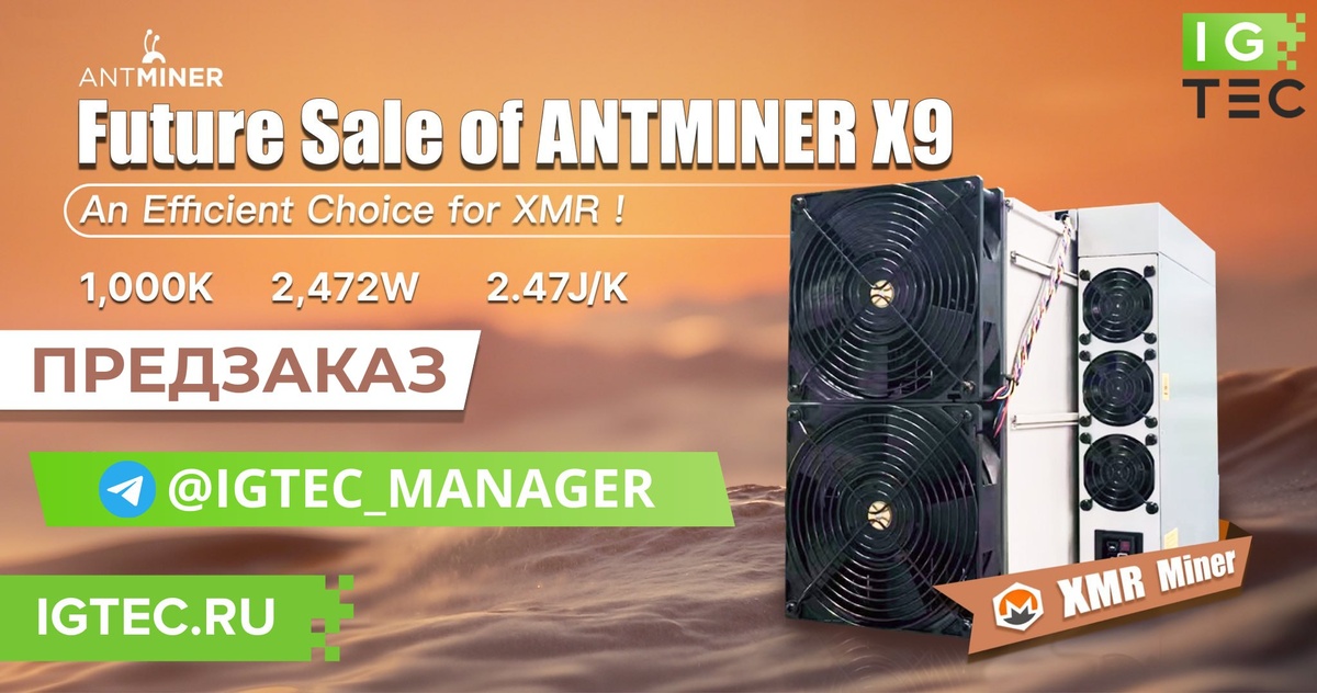 Bitmain представила новый ASIC для майнинга Monero - Antminer X9. Это первое обновление линейки под RandomX почти за два с половиной года, и разница с прошлым поколением - принципиальная. Ключевые характеристики Antminer X9: 🔗Алгоритм: RandomX ⚡️Хешрейт: 1000 kH/s 🔌Потребление: 2472 W 🔋Эффективность: 2,47 J/K Сравнение с Antminer X5 (сентябрь 2023): 🔹Рост хешрейта: +372% (с 212 до 1000 kH/s) 🔹Потребление: +83% (с 1350 до 2472 W) 🔹Эффективность: лучше на 61% (с 6,37 до 2,47 J/K) Проще говоря: X9 потребляет больше, но делает это значительно эффективнее - прирост мощности кратно перекрывает рост энергозатрат. Для майнинга Monero это серьёзный шаг вперёд. 📆Предзаказ на Antminer X9 уже открыт. Первые поставки - июль 2026. IGTEC работает с Bitmain напрямую, что гарантирует наилучшие условия поставки. Если хотите получить новый майнер среди первых, обращайтесь к нашему менеджеру: 📱 Telegram: @igtec_manager ☎️ 8(800)770-08-62 Наш сайт / FAQ-бот / О компании