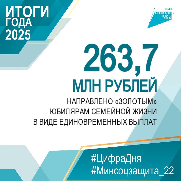 42,6 млн рублей. Супруги, уже отпраздновавшие юбилей в предыдущие годы, получили выплату к Дню семьи, любви и верности (08.07.2025) на сумму 221,2 млн рублей. ▶️Узнать о других итогах 2025 года можно на нашем сайте: https://clck.ru/3R7LKW #Цифрадня #Алтайскийкрай #Минсоцзащита_22