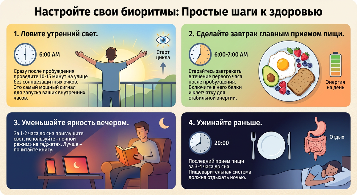 Финальное сообщение: Вам не нужно кардинально менять свою жизнь за один день. Небольшие, но последовательные изменения в распорядке дня могут оказать огромное влияние на ваше самочувствие, энергию и здоровье в долгосрочной перспективе. Начните прислушиваться к своему внутреннему дирижеру, и ваш биологический оркестр заиграет в полную силу.