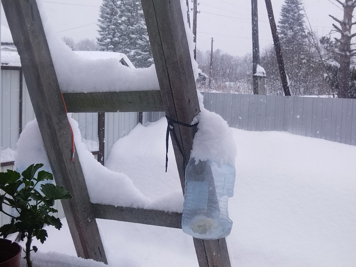 Судя по показаниям термометра на улице довольно тепло -8°. И судя по визуальному осмотру через окошко - снег идёт до сих пор. Валит и валит.