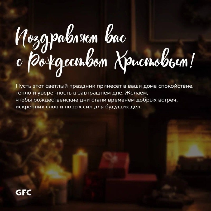 ! Поздравляем вас с Рождеством Христовым! Спасибо, что доверяете GFC и выбираете нас своим партнёром. Мы ценим это доверие и продолжаем работать для вас с ответственностью, вниманием и уважением к вашему бизнесу. Пусть Рождество наполнит сердце радостью, а новый год принесёт стабильность, развитие и благополучие. С наилучшими пожеланиями, Команда GFC 🤍
