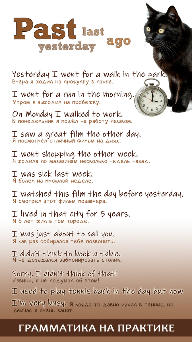Когда нужно сказать о каких-то завершенных в прошлом действиях, мы чаще всего используем Past Simple. В отличие от Present Perfect, здесь упоминается время, или оно понятно из контекста. Вспомогательные глаголы - did и didn't. Если нужно показать, что что-то было в прошлом, а теперь не так - используется used to + глагол. Подробнее о прошедшем времени - в этом видео: https://dzen.ru/video/watch/66087416b1265e7fba8a2c0b