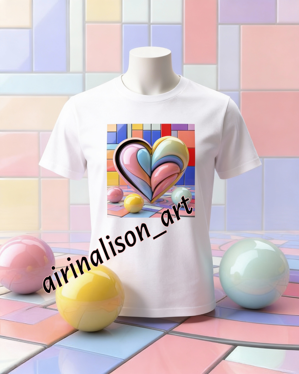 На этом мокапе - арт в стиле нео‑Мондриана: объёмные формы, плавные блики и мягкие цветовые переходы собираются в светящееся сердце на фоне геометричного пространства.