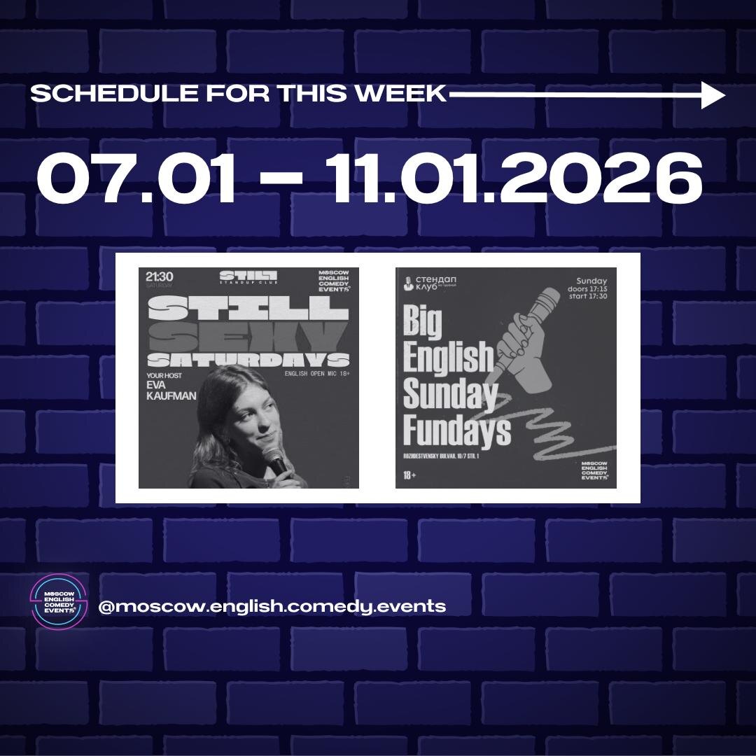 )❗️ -----‐----------------------- 🕤Saturday, January 10th, 9:30 PM – Still Sexy Saturdays 🎤Open Mic 🎟Entrance: Pay what you want (any paper note or transfer) 💵 🔗 Register for free 🫰 pay upon arrival 📍Still StandUp Moscow 🗺 Pokrovka 17c5, through the arch with the pink lights 🏙 Blue building directly inside the courtyard -----‐----------------------- 🕠Sunday January 11th, 5:30 PM - Big English Sunday Fundays 📺Special appearances by famous Russian comics 🎟️Entrance: FREE 💸 Donations welcome, one drink minimum 🔗Reserve for free 📍Stand Up Club на Трубной 🗺 Map: Rozhdestvensky Blvd, 10/7 С1
