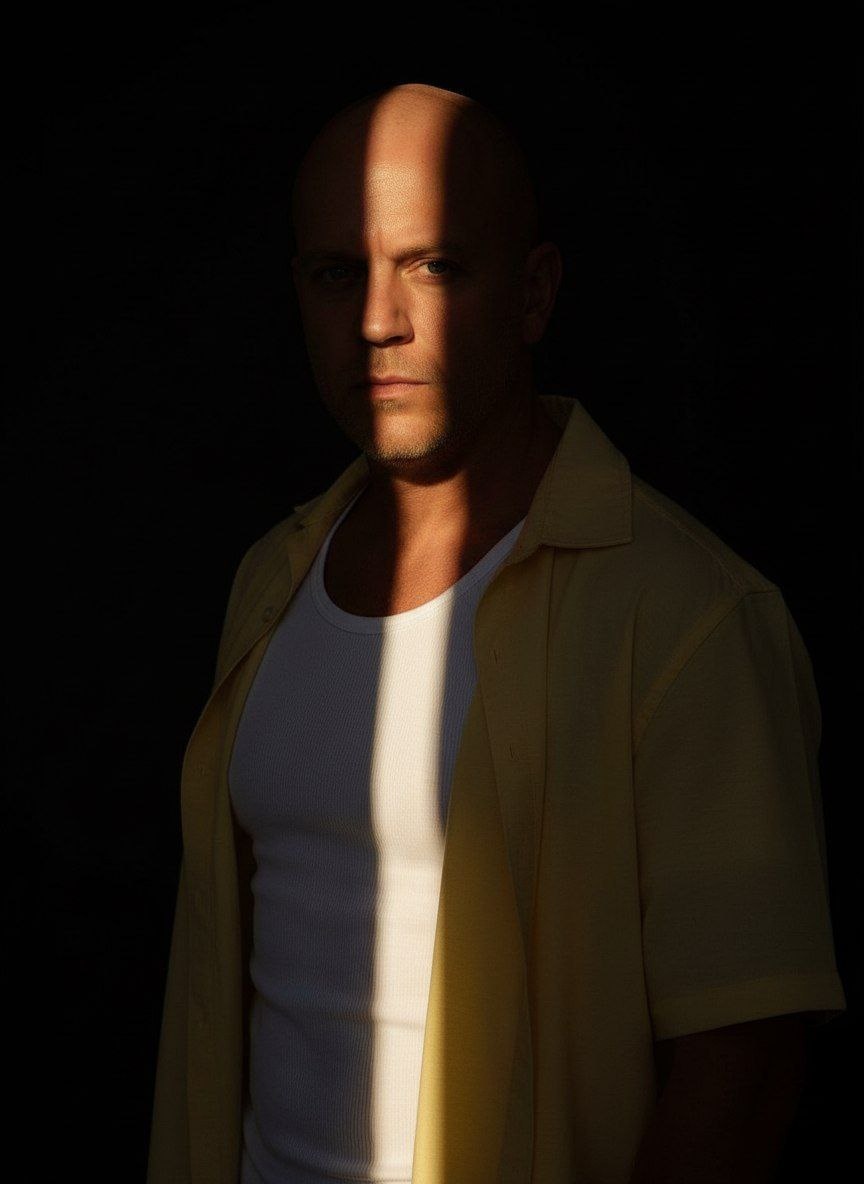 напряженные. Тонкий вертикальный луч теплого золотистого света прорезает прямо по центру лица и груди, отлично расщепляя свет и тень. Остальная часть лица исчезает в глубокую черную тьму. Он носит светло-бежевую открытую рубашку поверх белого внутреннего жилета. Драматическое освещение хиароскуро, высокий контраст, черный фон, ультрареалистичная текстура кожи, угрюмый редакционный стиль, неглубокая глубина поля, соотношение 4:5. 100% использую мой контрольный образ для загрузки ➡️ Генерируем ТУТ 💵 Отблагодарить 💥boost