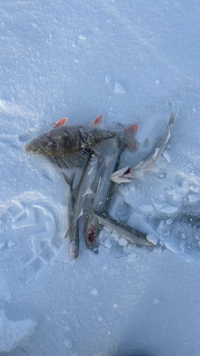 4 корюшки, 1 окунь. Холодно 🥶! На льду 6-7 человек.