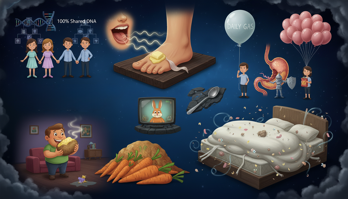 Представьте, что вы просыпаетесь утром и обнаруживаете, что кожа ваша слегка оранжевая — не от загара, а от моркови. Или вдруг замечаете, что можете "вкусить" чеснок… ногами. А потом узнаёте, что ваши двоюродные дети на самом деле почти родные. Звучит как сюжет фантастического сериала? А ведь это всё — реальность человеческого тела и его причудливых возможностей. Добро пожаловать в мир удивительных, порой даже пугающих, но полностью научно подтверждённых истин о том, как мы устроены. Знаете ли вы, что, когда однояйцевые близнецы вступают в брак и у них рождаются дети, эти дети не только являются двоюродными братьями и сёстрами, но и технически, по крайней мере в генетическом смысле, могут быть родными братьями и сёстрами? Нет, прежде чем вы спросите, мы не отправляемся в Алабаму, но, надо признать, для такого странного результата требуется очень специфический сценарий. Допустим, две сестры-близняшки вступают в отношения с двумя братьями-близнецами. Поскольку у всех однояйцевых близнецо