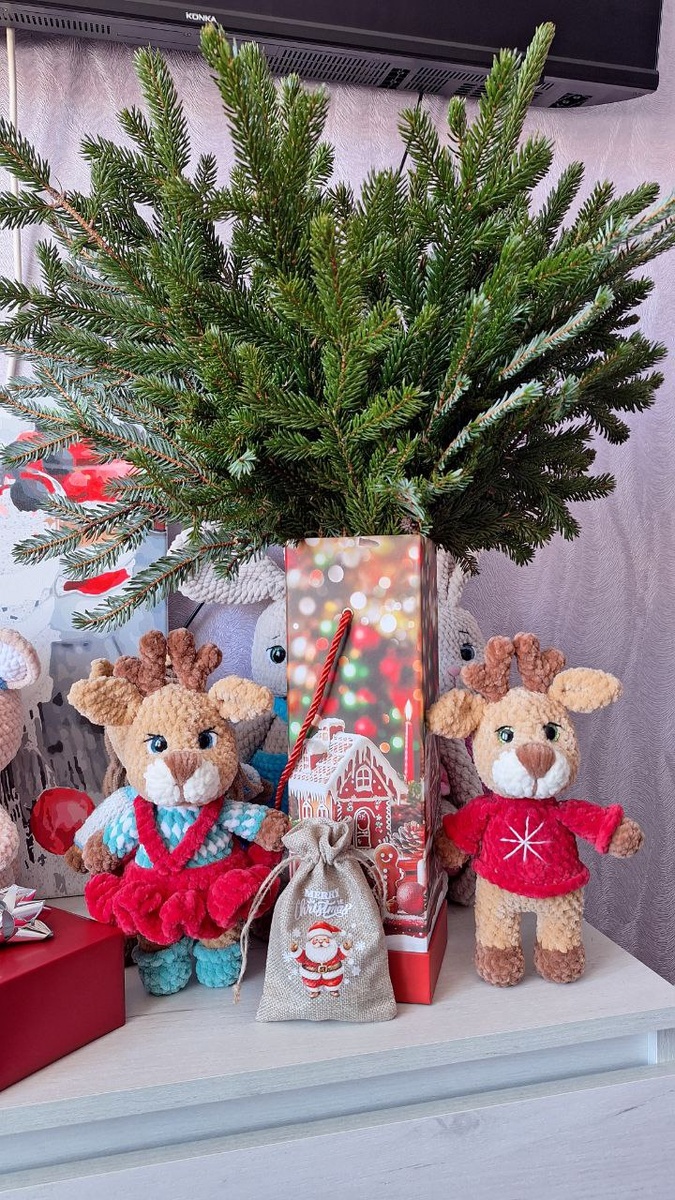 Сегодня Рождество и я связала оленяшек. Мальчика и девочку. У девочки юбочка съёмная.