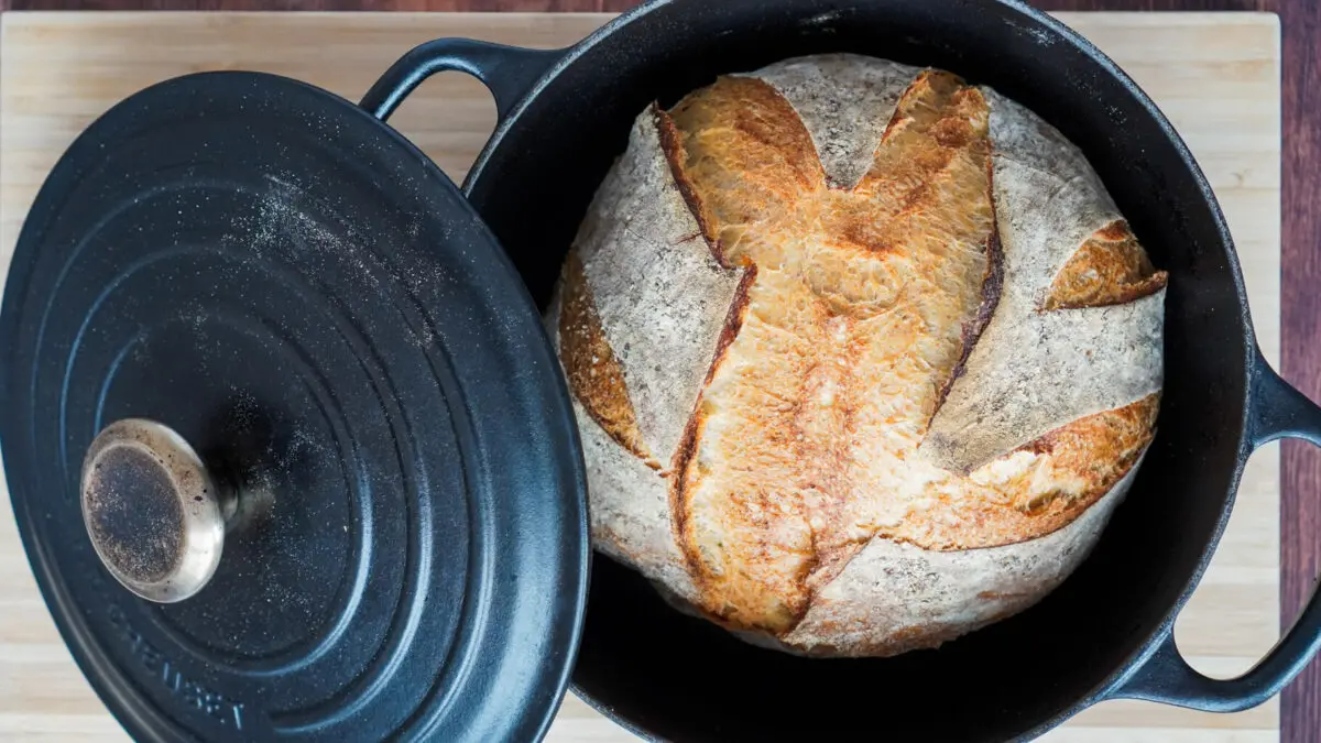 Простой способ выпекания вкуснейшего домашнего хлеба без пара и камня. Вам понадобится только хорошая чугунная кастрюля или казан с крышкой, что подходят для духовки, то есть имеют толстые стенки и не украшены пластиковыми или стеклянными деталями. 350 мл воды (теплой воды, не выше 30 °C) 8 гр. свежих дрожжей или 3 гр. сухих дрожжей 100 гр. цельнозерновой пшеничной муки 400 гр. пшеничной муки высшего сорта 1 ст. л. сахара 10 гр. соли Растворите дрожжи в миске с теплой водой, используя венчик. Добавьте муку, соль и сахар. Лучше всего предварительно смешать сухие ингредиенты отдельно, а затем добавить их в воду. Это поможет им лучше смешаться. Перемешайте все ингредиенты деревянной ложкой или руками, пока вся мука не будет полностью вмешана. Вымесите тесто 5 минут. Плотно накройте миску пищевой пленкой или крышкой и оставьте подниматься при комнатной температуре на 3 часа. Я сделала растягивание и складывание теста через 2 часа, а затем оставила тесто подниматься еще на час. Примерно