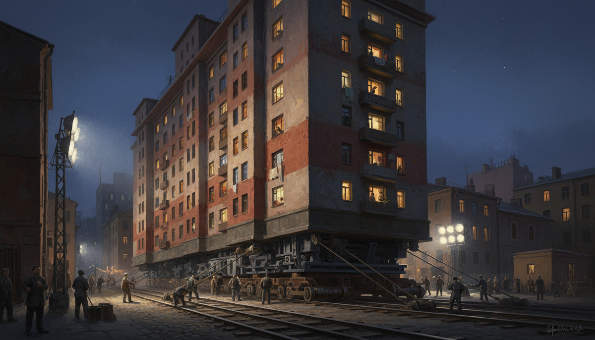 Двадцать три тысячи тонн исторического здания с трёхстами квартирами. Четыре месяца подготовки. Жильцам снова солгали про реконструкцию — слишком велик был риск паники.