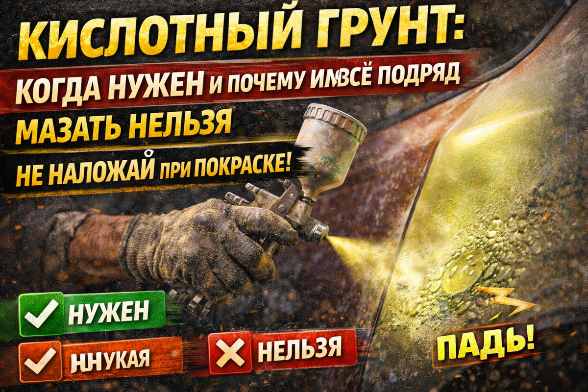 - Кислотник высох/выдержался → 2К грунт-наполнитель для толщины и выравнивания → шлифовка → база/лак.