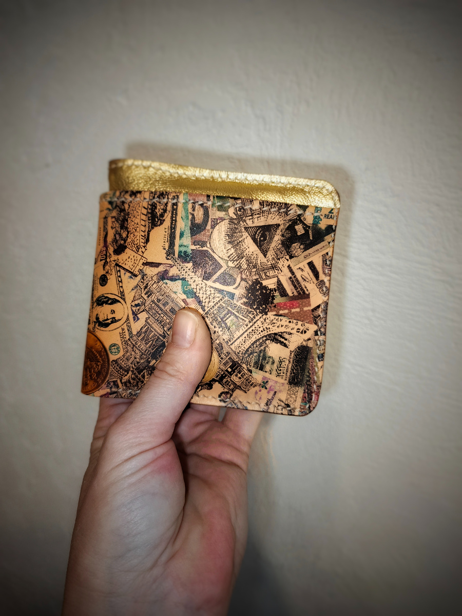 Друзья, только что закончила самый сложный бифолд из всех, что шила на курсе! Размер 11×11×3 см, премиальная итальянская кожа, текстура денег снаружи, золотые волны внутри. Но что пошло не по плану.