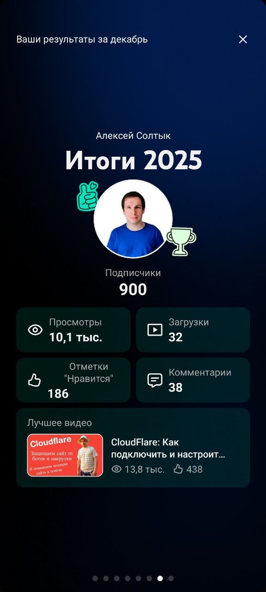 На YouTube — ровно 900 подписчиков. (Даже чуть больше, чем в ТГ 😏) За год: - 10,1 тыс. просмотров - 32 загрузки - 186 отметок “Нравится” - 38 комментариев Лучшее видео — про CloudFlare (13,8K просмотров). Видимо, защита от ботов и накруток — тема, которая волнует. Если вам удобнее смотреть видео — подпишитесь на мои каналы где угодно: ▶️ YouTube: https://m.youtube.com/@soltykseo 📺 Rutube: https://rutube.ru/channel/23913562 🎬 VK Видео: https://m.vkvideo.ru/@soltyk_seo 📝 Dzen: https://dzen.ru/soltykseo 📱 VK: https://m.vk.com/soltyk_seo Пишите в комментариях — где вам удобнее? И что снимать следующим? — Алексей Солтык (Статистика приложена)