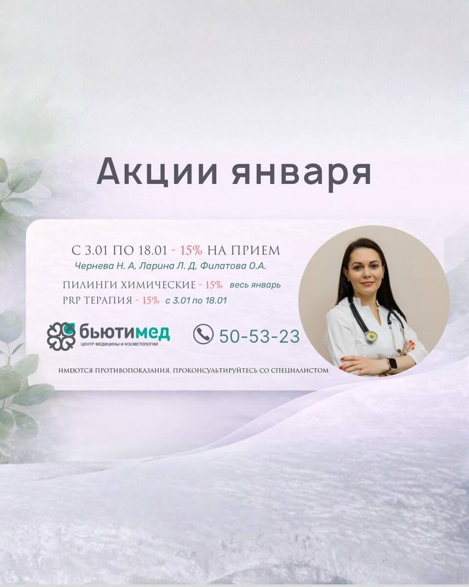 В январе в клинике действуют выгодные условия на ряд услуг. 🔹 –15% с 3 по 18 января: • Приём специалистов и УЗИ Врачи: Чернева Н.А, Ларина Л.Д, Филатова О. А. • PRP-терапия Поддержка и восстановление кожи с использованием собственных ресурсов организма 🔹 –15% ВЕСЬ ЯНВАРЬ: • Химические пилинги Процедуры для обновления кожи и улучшения её качества — по показаниям и после консультации специалиста 📍 Ульяновск, ул. Карбышева, 30 📞 Запись: 50-53-23 Имеются противопоказания. Необходима консультация специалиста. 📞 +7 (8422) 50-53-23 МАКС +79272706126 или через наш сайт 🌐 Берегите здоровье — подарите себе спокойствие и уверенность ❤️ #БьютиМед #гастроэндекринолог #анализы #Ульяновск #здоровье #косметологульяновск