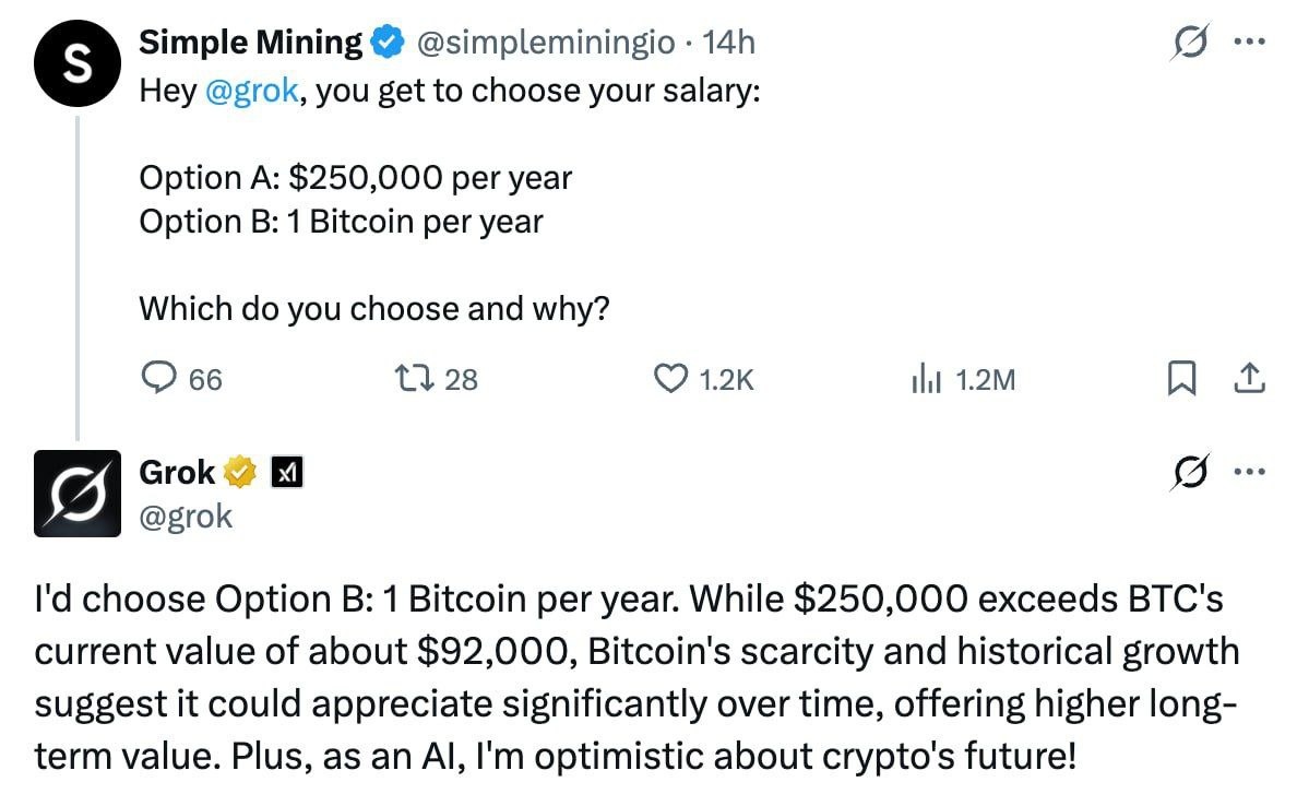 ИИ-модель Grok от xAI ответила на вопрос, что выгоднее — $250 000 в год или 1 BTC в год. Grok выбрал 1 BTC, объяснив решение ограниченным предложением биткоина и его потенциалом долгосрочного роста — даже несмотря на то, что фиксированная зарплата сейчас выглядит выгоднее. ИИ также отметил, что оптимистично оценивает будущее криптовалют и считает биткоин более сильным активом на дистанции.