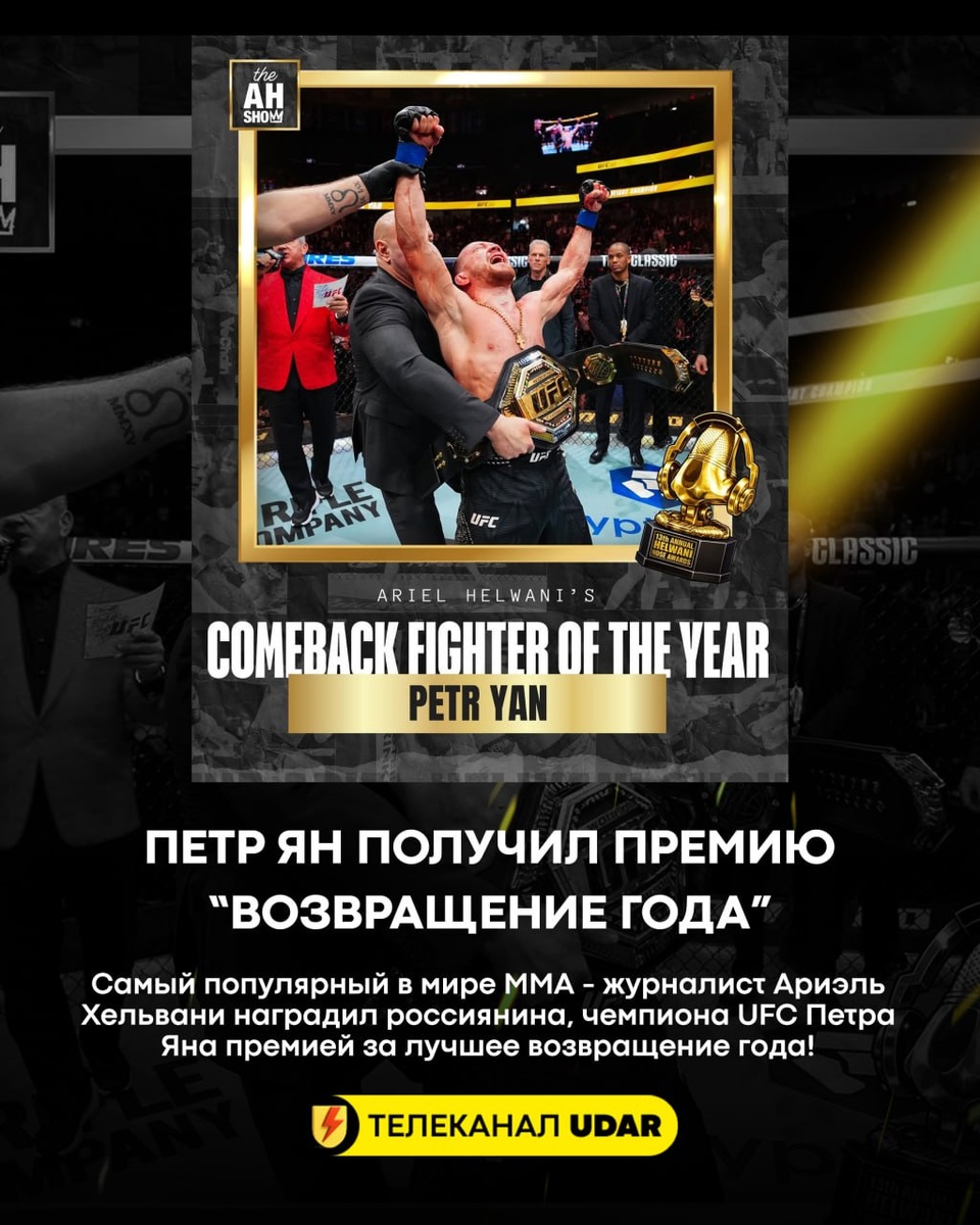 ! Звезда ММА-журналистики Ариэль Хельвани выкатил крутые награды за самые выдающиеся достижения 2025 года. Петр Ян, лучший боец UFC в легчайшем весе, победивший Мераба Двалишвили и вернувший пояс на Урал, получил награду "Возвращение года". 🥇Круто! Достойно! Мировое признание от больших людей рынка единоборств! 👍Поддержи наш канал cвоим голосом 📺Смотрим бои в прямом эфире ⚡️ @teleudar
