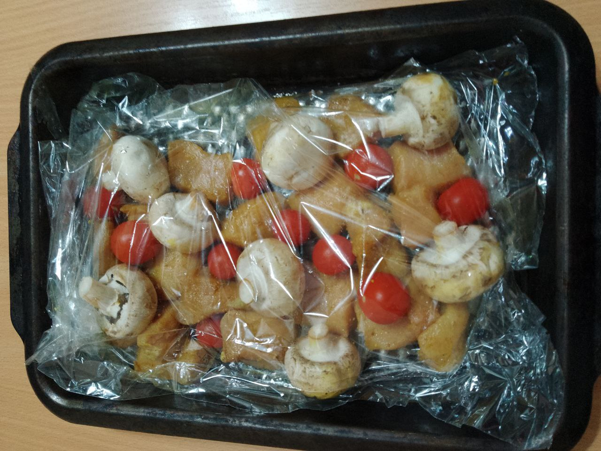 Это простой рецепт приготовления мяса, которым я хочу сегодня с вами поделиться. Ним чего сложного процесс не представляет. И пропорции ингридиентов могут быть совершенно разные. Но, всегда получается вкусно. а ешё обращаю внимание на эстетику блюда, которое можно представить на праздничном столе и в повседневной жизни. Нам понадобиться: * свинина 500 гр.; Впрочем, в данное блюдо вы можете добавить свои любимые овощи, специи, полёт фантазии не ограничен. В первую очередь мы нарежем мясо небольшими кубиками и обжарим их на сковороде до красивой золотистой корочки. Затем в глубокой чашке смешиваем мясо с нарезанными овощами, солим и добавляем специи. Я добавляю ещё немного соевого соуса. Но, это на любителя. Полученную смесь помещаем в мешёк (рукав) для запекания и отправляем на противень в разогретую до 180-200 гр. дузовку примерно на 30 минут. На следующем этапе вскрываем мешок и проверяем ножём или вилкой готовность мяса. Если оно стало мягким мешёк не закрываем, а даём выпариться