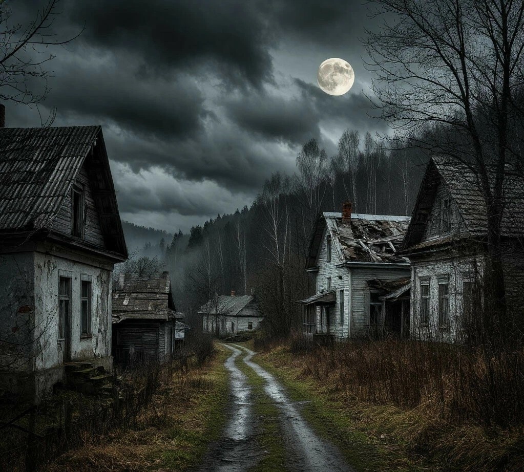 Под мрачным серым небом, когда тучи сгущались до предела, деревушка, скрытая среди густых лесов, погрузилась в таинственную тишину. Старые дома с обветшалыми крышами стояли на склонах, будто охраняя свои секреты. Ветер тихо шептал сквозь ветви голых деревьев, создавая ощущение, будто кто-то наблюдает из тени.