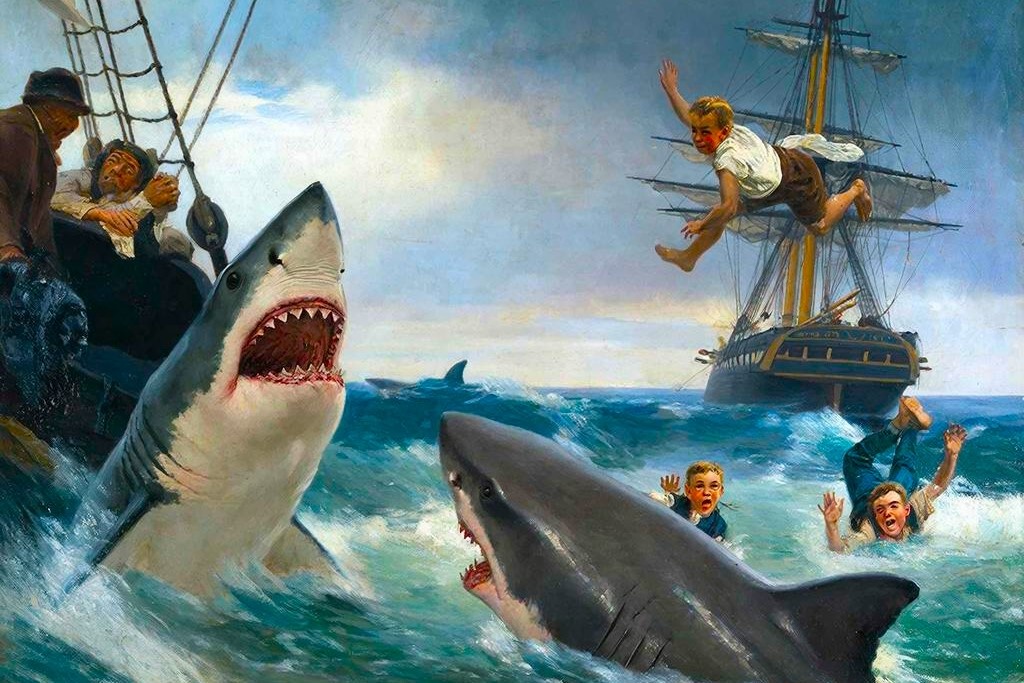 «Акула» Рассказ Льва Толстого-Читать Наш корабль стоял на якоре у берега Африки. День был прекрасный, с моря дул свежий ветер; но к вечеру погода изменилась: стало душно и точно из топленной печки несло на нас горячим воздухом с пустыни Сахары. Перед закатом солнца капитан вышел на палубу, крикнул: «Купаться!» — и в одну минуту матросы попрыгали в воду, спустили в воду парус, привязали его и в парусе устроили купальню. На корабле с нами было два мальчика. Мальчики первые попрыгали в воду, но им тесно было в парусе, и они вздумали плавать наперегонки в открытом море. Оба, как ящерицы, вытягивались в воде и что было силы поплыли к тому месту, где был бочонок над якорем. Один мальчик сначала перегнал товарища, но потом стал отставать. Отец мальчика, старый артиллерист, стоял на палубе и любовался на своего сынишку. Когда сын стал отставать, отец крикнул ему: — Не выдавай! Понатужься! Вдруг с палубы кто-то крикнул: «Акула!» — и все мы увидали в воде спину морского чудовища. Акула плыла пр