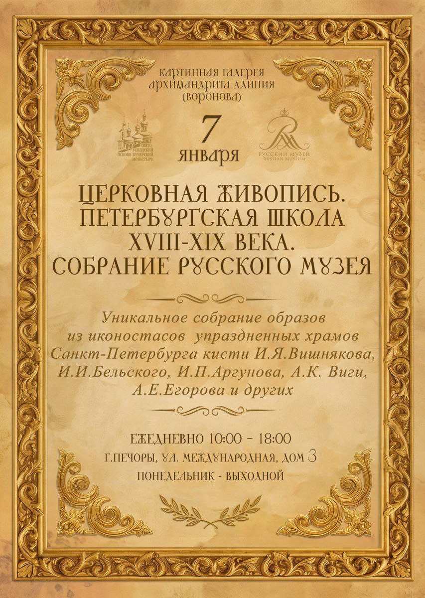 7 января 2026 года, в праздник Рождества Христова, в Картинной галерее архимандрита Алипия (Воронова) при Свято-Успенском Псково-Печерском монастыре состоится знаковое событие — открытие выставки "Церковная живопись. Петербургская школа середины XVIII – первой четверти XIX века". Экспозиция полностью сформирована из фондов Государственного Русского музея. Об этом сообщили в телеграм-канале Псковской епархии. Центральное место на выставке занимают 17 образов из иконостаса Троицкой соборной церкви — первого православного храма Санкт-Петербурга. Иконы были созданы в 1755 году выдающимся русским живописцем Иваном Вишняковым. Судьба этого иконостаса уникальна: сам деревянный храм, заложенный еще Петром I в 1703 году и свидетель важнейших государственных триумфов, был снесен в 1934 году. Благодаря сотрудникам Русского музея образа были спасены и отреставрированы, что позволяет сегодня увидеть подлинную живопись елизаветинского времени. Выставка дает редкую возможность проследить развитие с