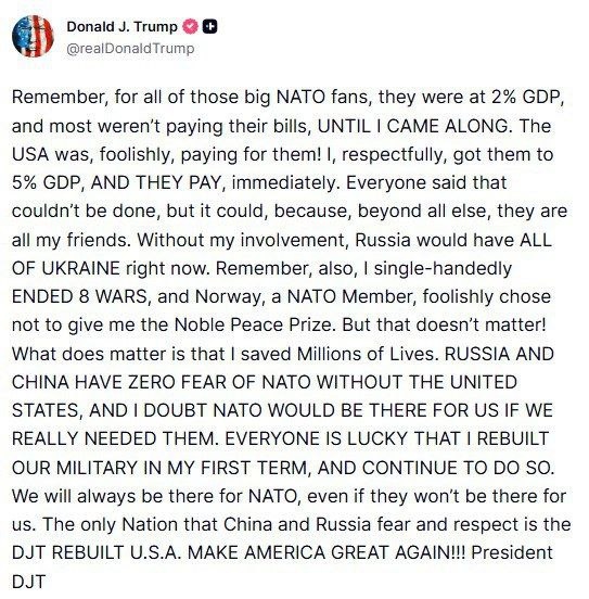 ' Trump blasts 'NATO fans' by claiming 'Russia and China have zero fear of NATO without us' 'Without me, Russia would have ALL OF UKRAINE now, I SINGLEHANDEDLY ended 8 wars'