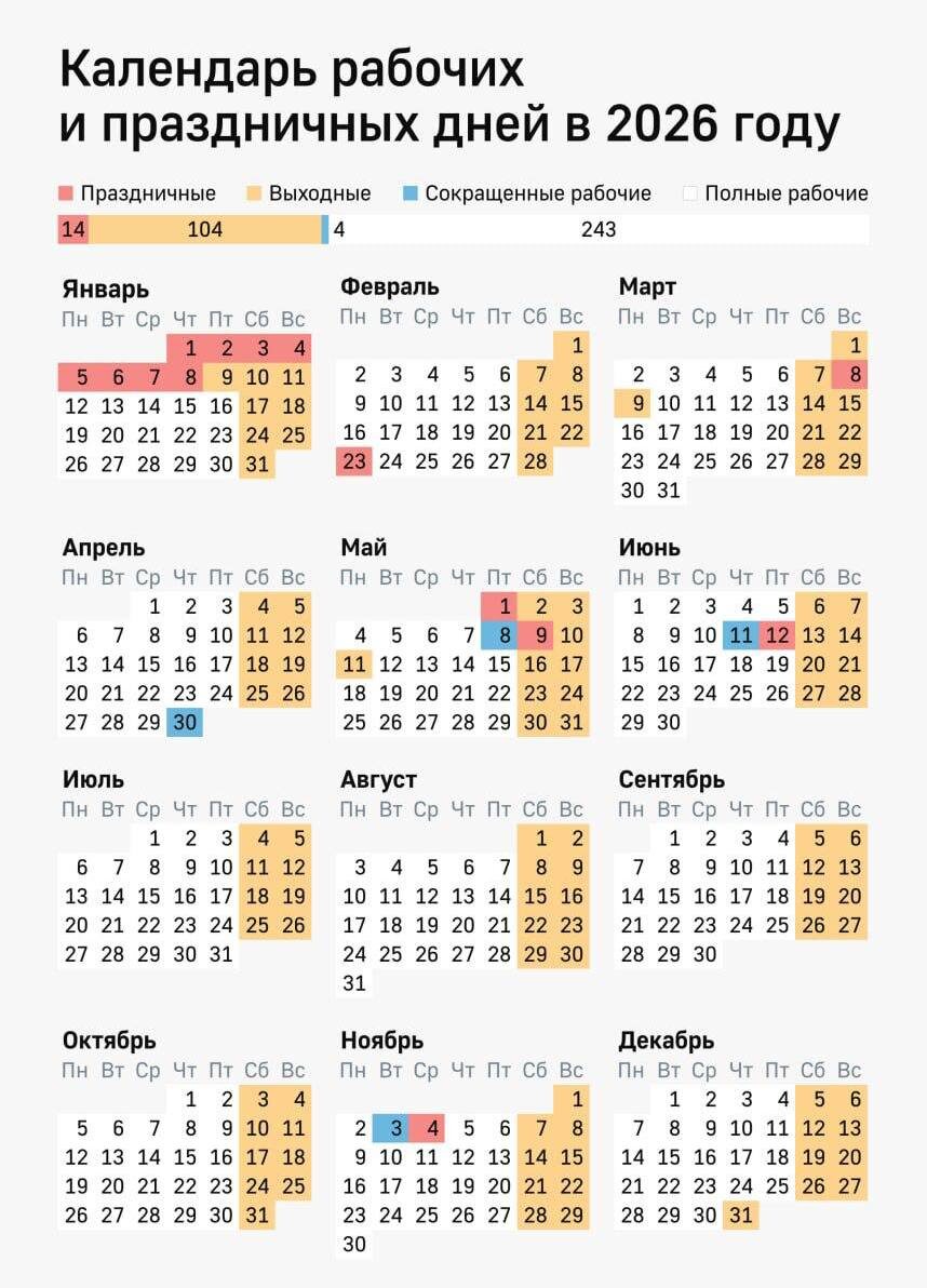 В 2026 году на выходные и официальные праздники приходится 118 дней. Это почти четыре месяца отдыха в сумме с праздниками и выходными. Всего в году 247 рабочих дней, а выходных и праздничных — 118, то есть фактически дней отдыха почти в 2,1 раза меньше, чем рабочих. 💜 Другие интересные новости в нашем канале в МАХ - присоединяйтесь!