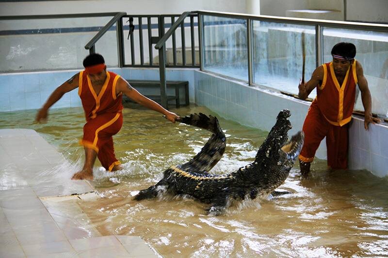 - что показывают: дрессировщики демонстрируют трюки — открывают крокодилам пасти, засовывают туда руки, заставляют их переворачиваться. Всё под строгим контролем;
