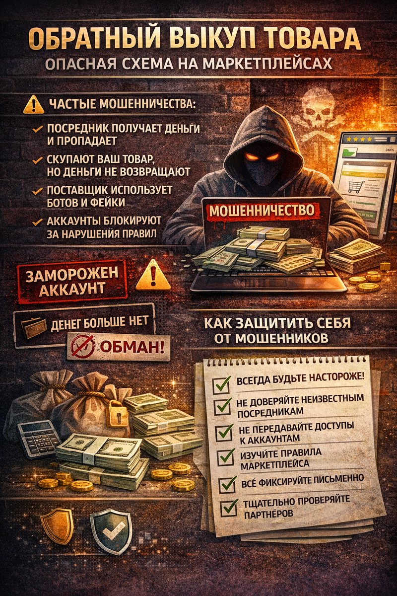 В последние годы обратный выкуп товара стал популярным инструментом продвижения на маркетплейсах. Однако вместе с ростом спроса появились и многочисленные схемы обмана. Все чаще предприниматели и частные лица сталкиваются с тем, что обратный выкуп товара — мошенничества, замаскированные под легальные услуги. Разберёмся, как работает эта схема, где кроются риски и как защитить себя. Для начала важно понять, что такое обратный выкуп товара. Это практика, при которой товар формально покупается (часто через маркетплейс), а затем возвращается или компенсируется продавцом. Основная цель — повысить продажи, рейтинг карточки товара и количество отзывов. На практике обратный выкуп товара может выглядеть так: Сама по себе схема находится в «серой зоне» правил маркетплейсов, но особенно опасной она становится, когда в процесс вмешиваются мошенники. Обратный выкуп на маркетплейсах активно используется на популярных площадках. Именно здесь чаще всего возникают мошеннические схемы. Злоумышленники м