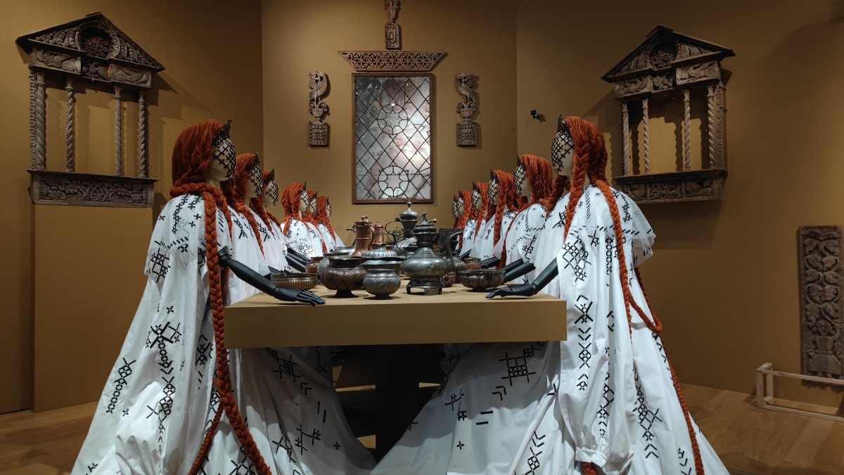 Язык этой выставки — язык русских архетипов, переложенный на коды высокой моды: здесь старинные мотивы и современные приёмы сливаются в единую ткань смыслов. В зале «Зачарованные» зрителей встречают двенадцать девушек, сцеплённых косами — живой символ женского единения; их платья, выстроенные на основе рубахи и расшитые чёрным крестом.