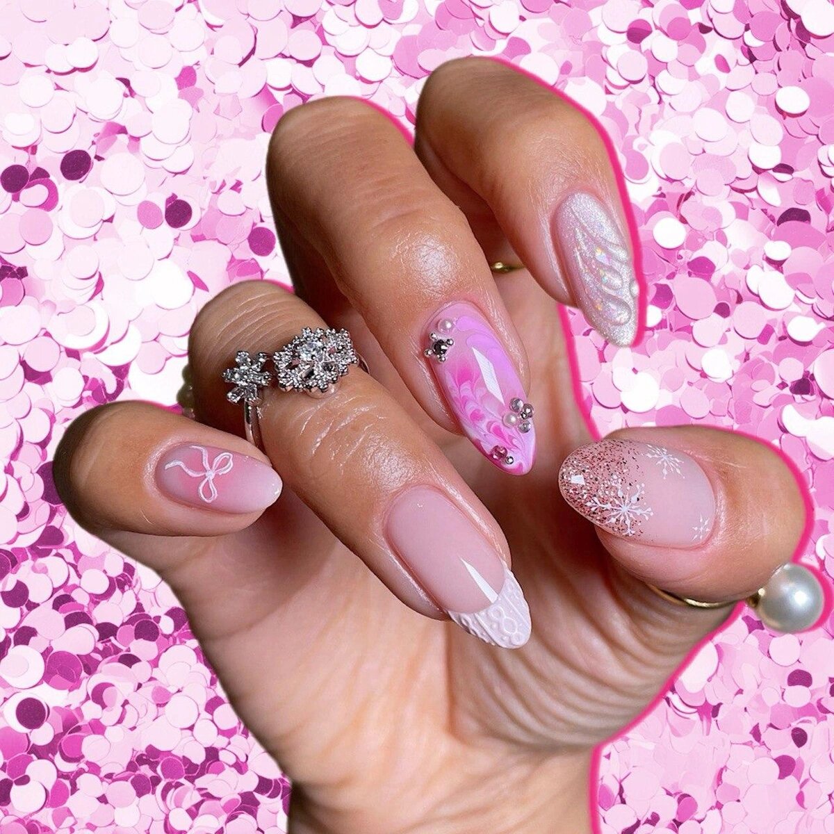 Маникюр со снежинками или яркий розовый дизайн с 3D-элементами? Решай, что тебе больше по душе 💅 Зима — отличное время для экспериментов. Снежный маникюр стал одной из самых модных идей для обновления своего образа. Он не ограничивается только белым цветом, как можно подумать. Я подготовила для тебя несколько интересных вариантов — от сияющих с мишками до маникюра с личными ассоциациями. Какой из них тебе понравится больше? В детстве ты, наверное, пыталась поймать снежинку, чтобы рассмотреть её поближе. Теперь это не нужно — достаточно взглянуть на корейский снежный маникюр! Начни с лака нежно-голубого или белого цвета — они сразу напоминают о зиме. Добавь объемные элементы для нейл-арта. Создать микроскопические детали с помощью 3D-геля сложно, почти невозможно. Зато можно добавить несколько пузырьков — небрежность сейчас в моде! В детстве ты, наверняка, обожала кататься на санках с снежных горок. Корейские нейл-арты часто напоминают о детстве. Например, маникюр с мишками — отличная